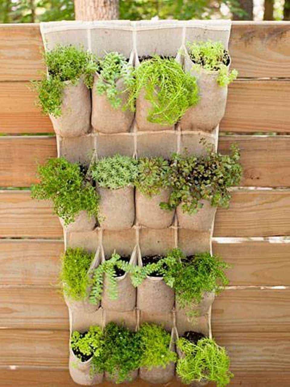 Recycle an old shoe hanger for a space-saving plant pocket! You could have herbs, edibles, and even perennials.